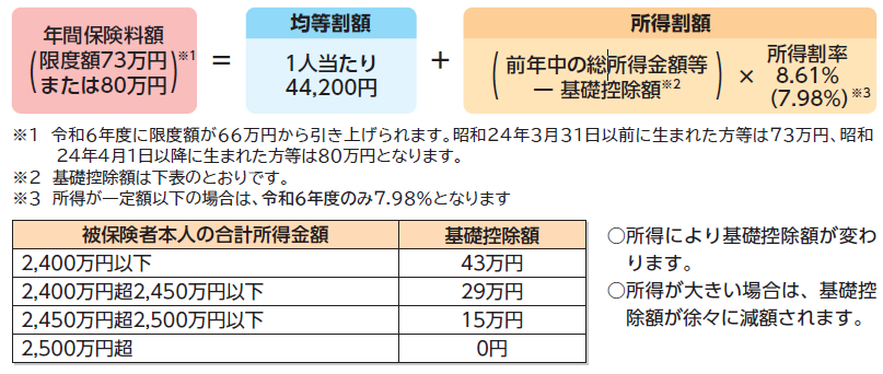 保険料は、被保険者が等しく負担する「均等割額」と、被保険者の所得に応じて負担する「所得割額」の合計です。前年中の総所得金額等や世帯の所得状況により、個人単位で賦課します。